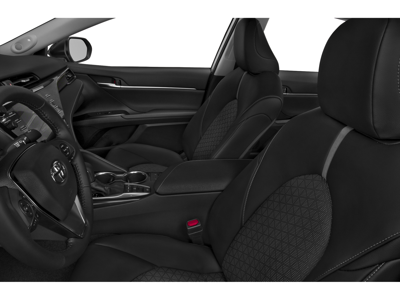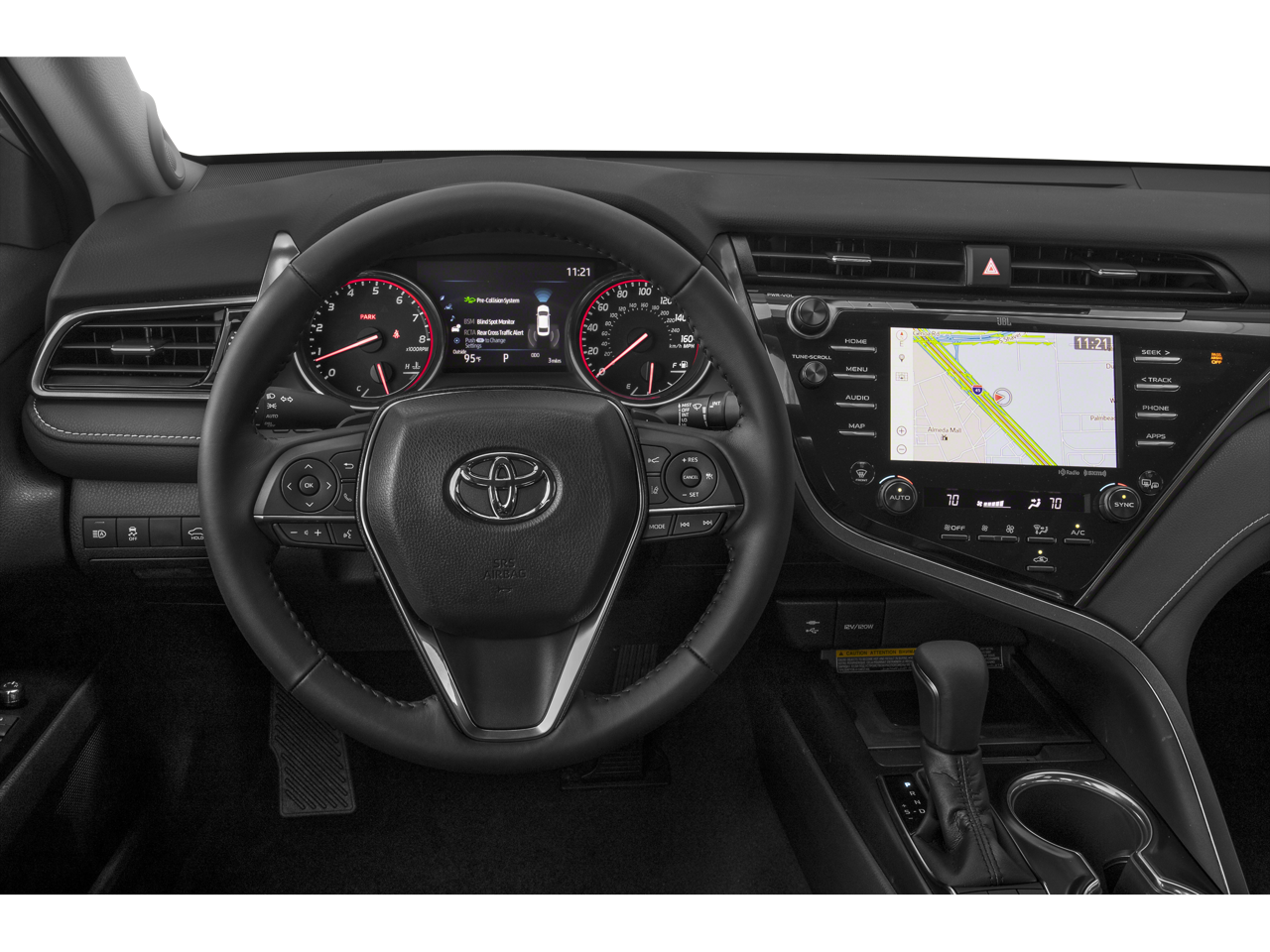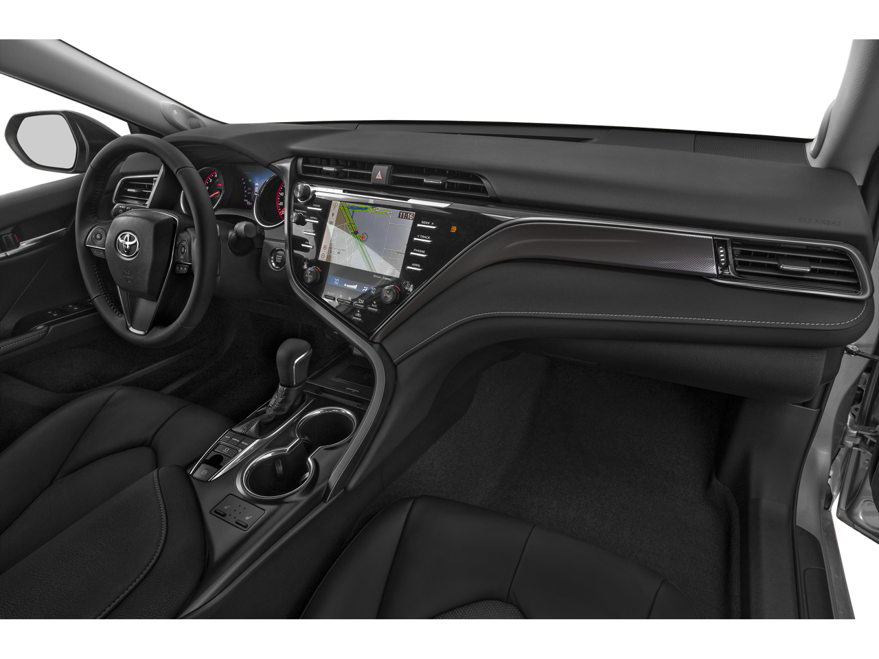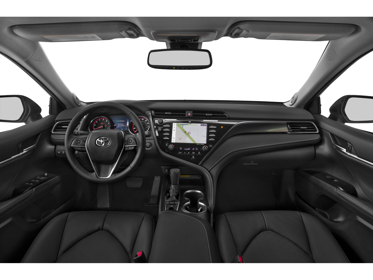 This Camry is well equipped with Protection Package (Q2) (Door Sill Protectors and Rear Bumper Applique (Black)), All-Weather Floor Liner Package, Black Leather, 4-Wheel Disc Brakes, 6 Speakers, ABS brakes, Air Conditioning, Alloy wheels, AM/FM radio: SiriusXM, Apple CarPlay, Auto High-beam Headlights, Auto-dimming Rear-View mirror, Automatic temperature control, Brake assist, Bumpers: body-color, CD player, Compass, Delay-off headlights, Driver door bin, Driver vanity mirror, Dual front impact airbags, Dual front side impact airbags, Electronic Stability Control, Emergency communication system: Safety Connect, Exterior Parking Camera Rear, Four wheel independent suspension, Front anti-roll bar, Front Bucket Seats, Front Center Armrest, Front dual zone A/C, Front reading lights, Fully automatic headlights, Garage door transmitter: HomeLink, Heated door mirrors, Heated front seats, Illuminated entry, Knee airbag, Leather Shift Knob, Low tire pressure warning, Multi-Stage Heated Front Bucket Seats, Occupant sensing airbag, Outside temperature display, Overhead airbag, Overhead console, Panic alarm, Passenger door bin, Passenger vanity mirror, Perforated Leather Seat Trim, Power door mirrors, Power driver seat, Power passenger seat, Power steering, Power windows, Radio data system, Radio: Entune 3.0 Audio Plus w/App Suite, Rear anti-roll bar, Rear reading lights, Rear seat center armrest, Rear side impact airbag, Rear window defroster, Remote keyless entry, Security system, Speed control, Speed-sensing steering, Split folding rear seat, Spoiler, Sport steering wheel, Steering wheel mounted audio controls, Tachometer, Telescoping steering wheel, Tilt steering wheel, Traction control, Trip computer, Turn signal indicator mirrors, Variably intermittent wipers, and Wheels: 8.0J x 19" Black Machined-Finish Alloy.