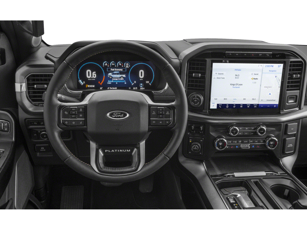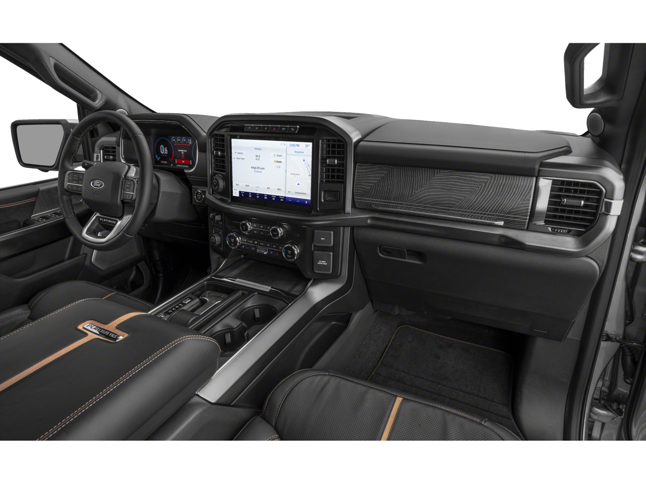 This F-150 is well equipped with Equipment Group 701A High (Power Tailgate and Radio: B&O Unleashed Sound System by Bang & Olufsen), Ford Co-Pilot360 Active 2.0 Package (Active Park Assist 2.0 and BlueCruise Hands-Free Driving), Tow Technology Package (360 Degree Camera and Pro Trailer Backup Assist), 3.5L PowerBoost Full-Hybrid V6, 4WD, 20" Polished Aluminum Wheels, 4-Wheel Disc Brakes, 8 Speakers, ABS brakes, Adaptive Steering, Adjustable pedals, Air Conditioning, Alloy wheels, AM/FM radio: SiriusXM with 360L, Auto High-beam Headlights, Auto tilt-away steering wheel, Auto-dimming door mirrors, Auto-dimming Rear-View mirror, Automatic temperature control, Brake assist, Bumpers: body-color, Class IV Trailer Hitch Receiver, Compass, Delay-off headlights, Driver door bin, Driver vanity mirror, Dual front impact airbags, Dual front side impact airbags, Electronic Stability Control, Emergency communication system: SYNC 4 911 Assist, Exterior Parking Camera Rear, Front anti-roll bar, Front Bucket Seats, Front Center Armrest, Front dual zone A/C, Front fog lights, Front reading lights, Front wheel independent suspension, Fully automatic headlights, Garage door transmitter, Hard Folding Tonneau Pickup Box Cover, Heated door mirrors, Heated front seats, Heated rear seats, Heated steering wheel, Illuminated entry, Integrated Trailer Brake Controller, Interior Work Surface, Low tire pressure warning, Memory seat, Navigation system: Connected Navigation (90-Day Trial), Occupant sensing airbag, Outside temperature display, Overhead airbag, Overhead console, Panic alarm, Passenger door bin, Passenger vanity mirror, Pedal memory, Power door mirrors, Power driver seat, Power passenger seat, Power steering, Power windows, Pro Power Onboard - 7.2KW, Radio data system, Radio: B&O Sound System by Bang & Olufsen, Rain sensing wipers, Rear reading lights, Rear seat center armrest, Rear step bumper, Rear window defroster, Remote keyless entry, Security system, Speed control, Speed-sensing steering, Split folding rear seat, Steering wheel memory, Steering wheel mounted audio controls, SYNC 4 w/Enhanced Voice Recognition, Tachometer, Telescoping steering wheel, Tilt steering wheel, Tough Bed Spray-In Bedliner, Traction control, Tray Style Floor Liner, Trip computer, Turn signal indicator mirrors, Twin Panel Moonroof, Unique Multi-Contour Leather Bucket Seats, Variably intermittent wipers, Ventilated front seats, and Voltmeter.