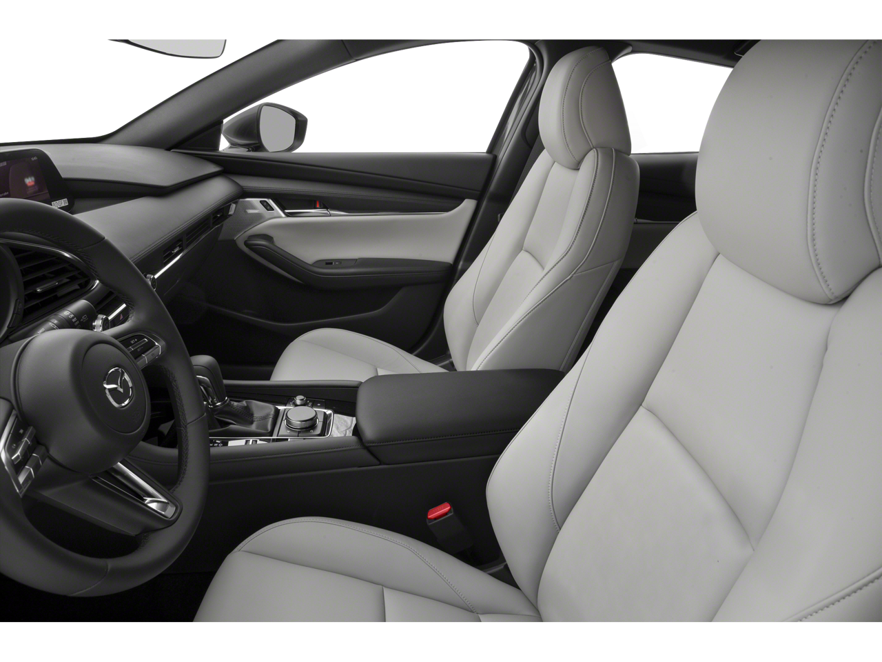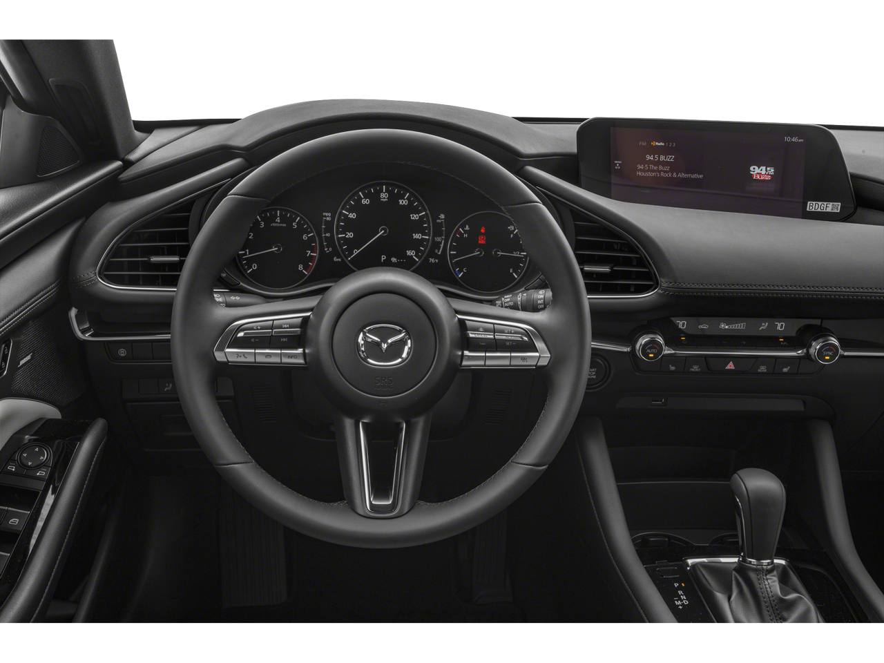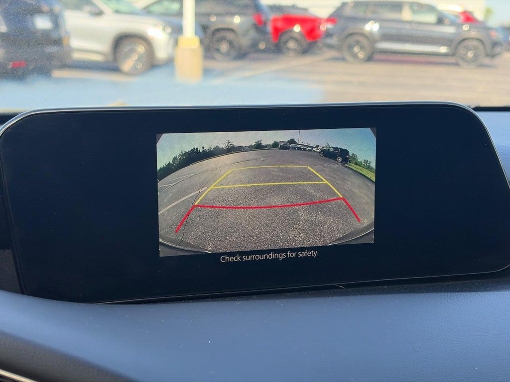 This Mazda Mazda3 is well equipped with 4-Wheel Disc Brakes, ABS brakes, Air Conditioning, Alloy wheels, AppLink/Apple CarPlay and Android Auto, Auto High-beam Headlights, Automatic temperature control, Brake assist, Bumpers: body-color, Compass, Delay-off headlights, Driver door bin, Driver vanity mirror, Dual front impact airbags, Dual front side impact airbags, Electronic Stability Control, Emergency communication system: Mazda Connected Services (3-year trial subscription included), Exterior Parking Camera Rear, Front anti-roll bar, Front Bucket Seats, Front Center Armrest, Front dual zone A/C, Front reading lights, Front wheel independent suspension, Fully automatic headlights, Heated Front Bucket Seats, Heated front seats, Illuminated entry, Knee airbag, Low tire pressure warning, Memory seat, Occupant sensing airbag, Outside temperature display, Overhead airbag, Overhead console, Panic alarm, Passenger door bin, Passenger vanity mirror, Power door mirrors, Power driver seat, Power moonroof, Power steering, Power windows, Radio data system, Radio: AM/FM Audio System, Rain sensing wipers, Rear seat center armrest, Rear window defroster, Rear window wiper, Remote keyless entry, Speed control, Speed-sensing steering, Split folding rear seat, Spoiler, Steering wheel mounted audio controls, Tachometer, Telescoping steering wheel, Tilt steering wheel, Traction control, Trip computer, Turn signal indicator mirrors, and Variably intermittent wipers.