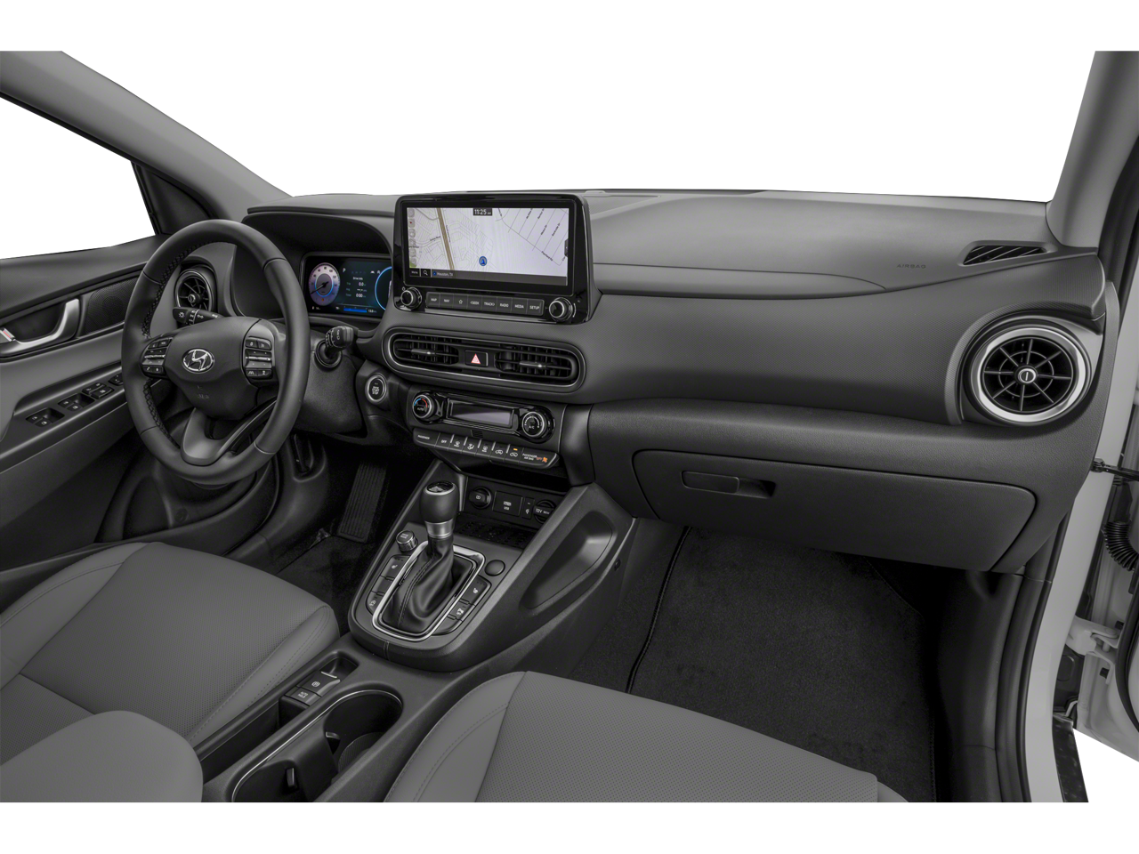 This Kona is well equipped with Cargo Package (Cargo Blocks, Cargo Net, and Cargo Tray), Option Group 01, 18" x 7.5J Alloy Wheels, 3.174 Axle Ratio, 4-Wheel Disc Brakes, 8 Speakers, ABS brakes, Air Conditioning, Alloy wheels, AM/FM radio: SiriusXM, Apple CarPlay & Android Auto, Auto High-beam Headlights, Auto-dimming Rear-View mirror, Automatic temperature control, Brake assist, Bumpers: body-color, Carpeted Floor Mats, Delay-off headlights, Driver door bin, Driver vanity mirror, Dual front impact airbags, Dual front side impact airbags, Electronic Stability Control, Emergency communication system: Blue Link Connected Car Service (3-year complimentary subscription), Exterior Parking Camera Rear, First Aid Kit, Four wheel independent suspension, Front anti-roll bar, Front Bucket Seats, Front Center Armrest, Front reading lights, Fully automatic headlights, Garage door transmitter: HomeLink, harman/kardon Speakers, Heated door mirrors, Heated Front Bucket Seats, Heated front seats, Illuminated entry, Leather Seat Trim, Leather Shift Knob, Leather steering wheel, Low tire pressure warning, Navigation System, Occupant sensing airbag, Outside temperature display, Overhead airbag, Overhead console, Panic alarm, Passenger door bin, Passenger vanity mirror, Power door mirrors, Power driver seat, Power moonroof, Power steering, Power windows, Radio: harman/kardon Premium Audio System, Rain sensing wipers, Rear anti-roll bar, Rear seat center armrest, Rear window defroster, Rear window wiper, Remote keyless entry, Security system, Speed control, Speed-sensing steering, Split folding rear seat, Spoiler, Steering wheel mounted audio controls, Tachometer, Telescoping steering wheel, Tilt steering wheel, Traction control, Trip computer, Turn signal indicator mirrors, Variably intermittent wipers, and Wheel Locks.