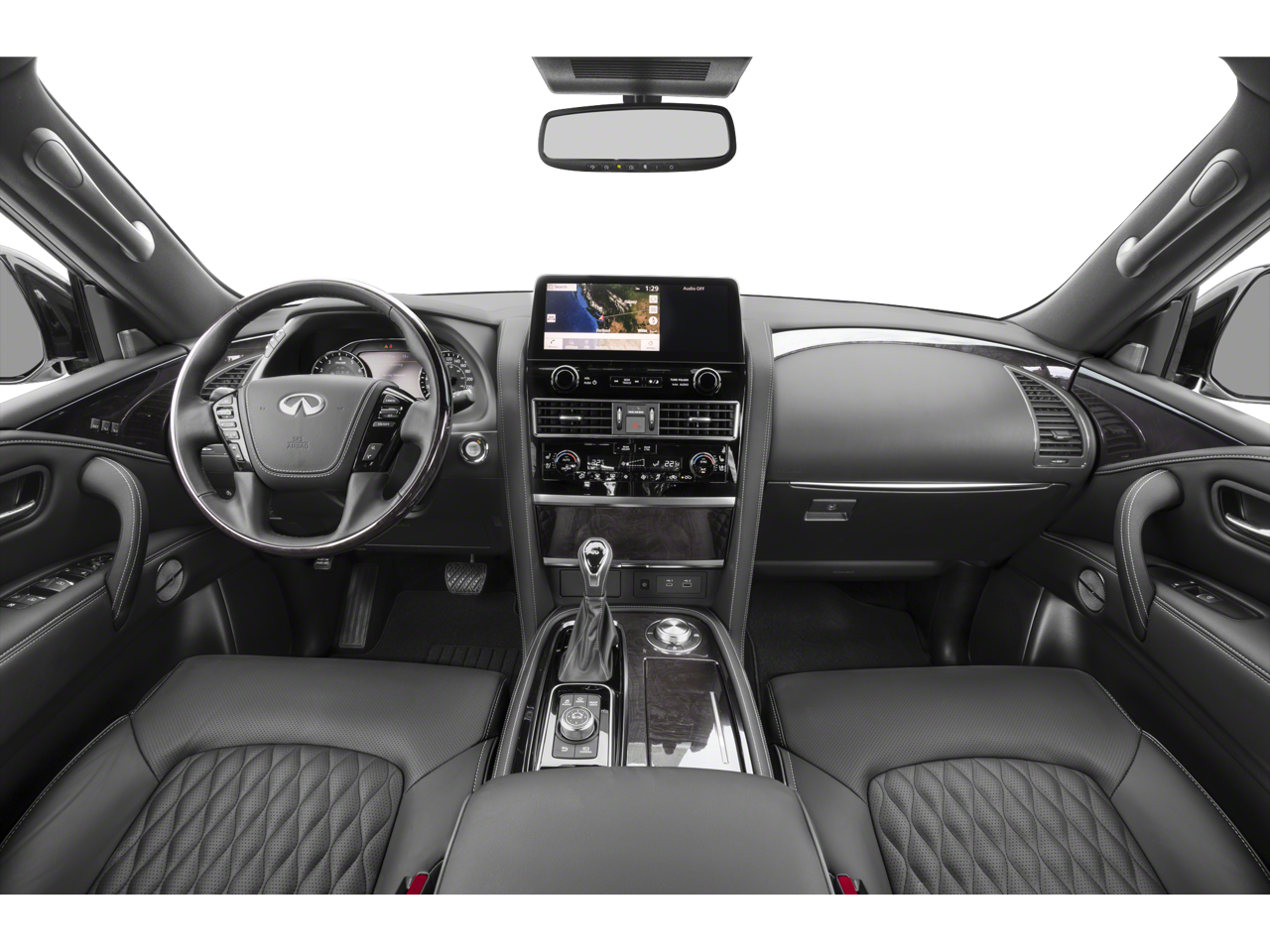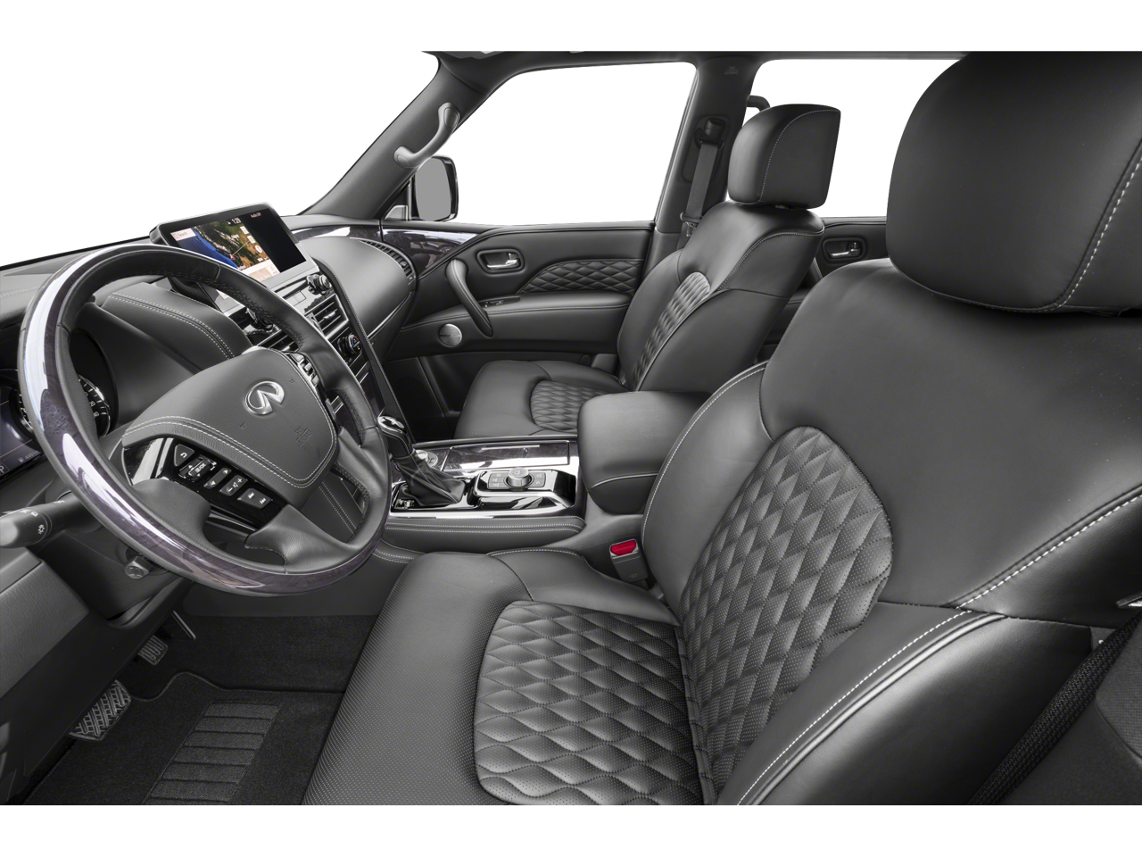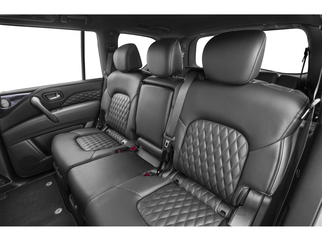 This QX80 is well equipped with Cargo Package (Cargo Net, Carpeted Cargo Mat, Center Console Tray, Console Net, and First-Aid Kit), Split Bench Seat Package, 13 Speakers, 2.937 Axle Ratio, 3rd row seats: split-bench, 4-Wheel Disc Brakes, ABS brakes, Air Conditioning, Alloy wheels, AM/FM radio: SiriusXM, Anti-whiplash front head restraints, Auto High-beam Headlights, Auto tilt-away steering wheel, Auto-dimming door mirrors, Auto-dimming Rear-View mirror, Auto-leveling suspension, Automatic temperature control, Brake assist, Bumpers: body-color, Compass, Delay-off headlights, Driver door bin, Driver vanity mirror, Dual front impact airbags, Dual front side impact airbags, Electronic Stability Control, Emergency communication system: INFINITI InTouch, Four wheel independent suspension, Front anti-roll bar, Front Bucket Seats, Front Center Armrest, Front dual zone A/C, Front fog lights, Front reading lights, Fully automatic headlights, Garage door transmitter: HomeLink, Heated door mirrors, Heated Front Bucket Seats, Heated front seats, Heated steering wheel, Illuminated entry, INFINITI Radiant Illuminated Kick Plates (N93), Leather Shift Knob, Leather steering wheel, Leather-Appointed Seats, Literature Kit, Low tire pressure warning, Memory seat, Navigation system: INFINITI InTouch Navigation, Occupant sensing airbag, Outside temperature display, Overhead airbag, Overhead console, Panic alarm, Passenger door bin, Passenger vanity mirror, Power door mirrors, Power driver seat, Power Liftgate, Power moonroof, Power passenger seat, Power steering, Power windows, Premium audio system: Bose, Radio data system, Radio: Bose Premium Audio System w/13 Speakers, Rain sensing wipers, Rear air conditioning, Rear anti-roll bar, Rear reading lights, Rear seat center armrest, Rear window defroster, Rear window wiper, Reclining 3rd row seat, Remote keyless entry, Security system, Speed control, Speed-sensing steering, Split folding rear seat, Spoiler, Steering wheel memory, Steering wheel mounted audio controls, Tachometer, Telescoping steering wheel, Tilt steering wheel, Traction control, Trip computer, Turn signal indicator mirrors, Variably intermittent wipers, Voltmeter, and Wheels: 20" x 8.0" Aluminum-Alloy.