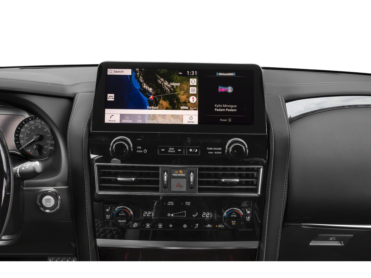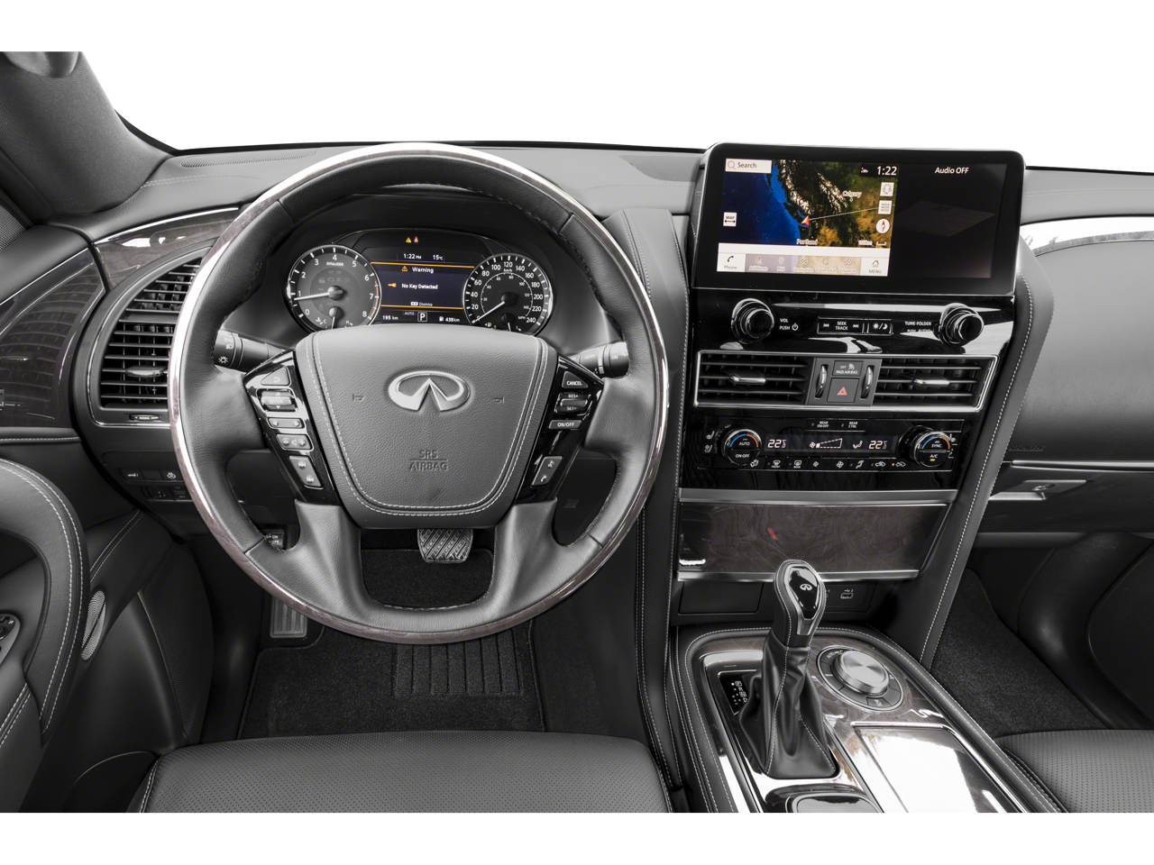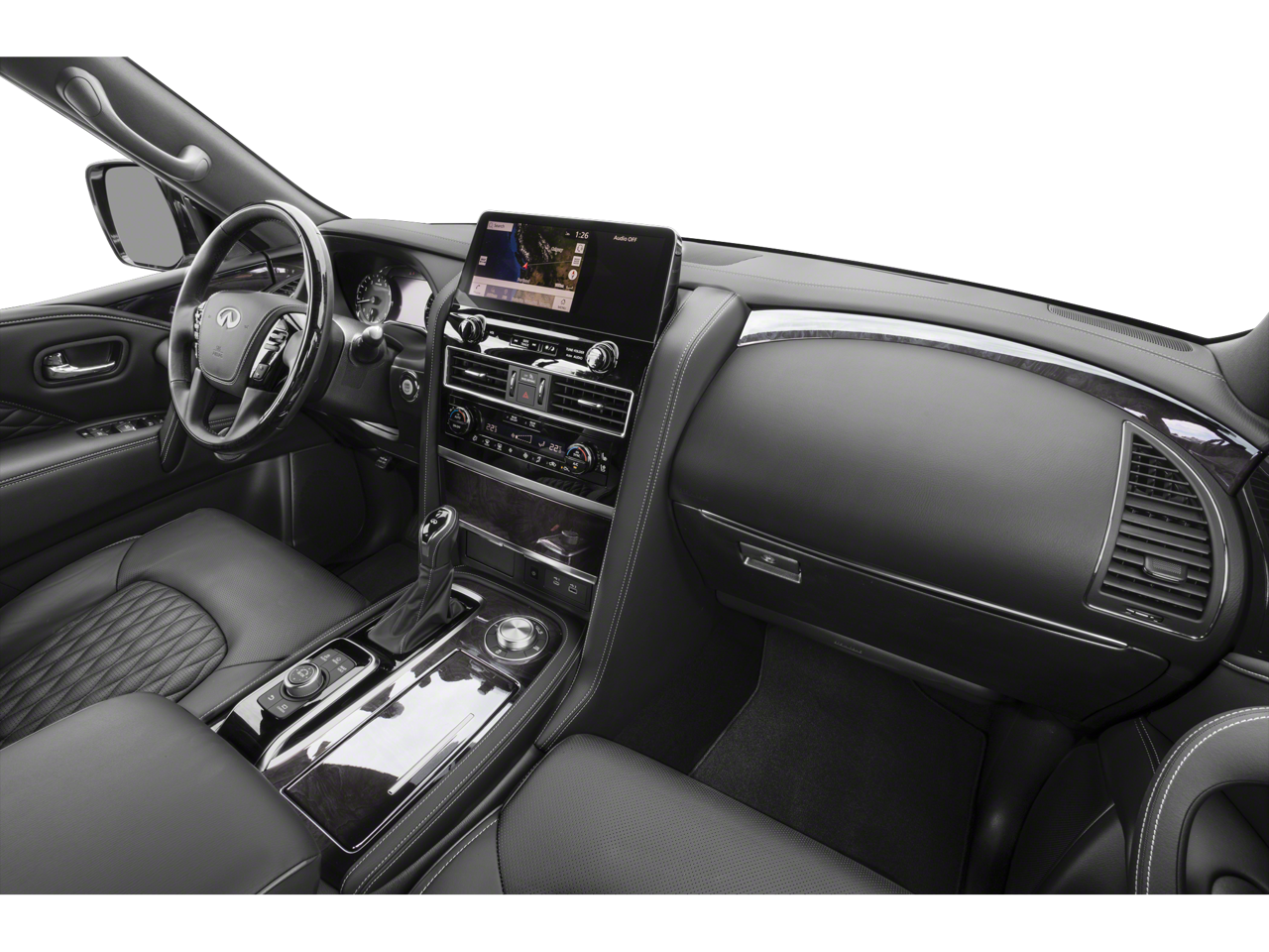 This QX80 is well equipped with Cargo Package (Cargo Net, Carpeted Cargo Mat, Center Console Tray, Console Net, and First-Aid Kit), Split Bench Seat Package, 13 Speakers, 2.937 Axle Ratio, 3rd row seats: split-bench, 4-Wheel Disc Brakes, ABS brakes, Air Conditioning, Alloy wheels, AM/FM radio: SiriusXM, Anti-whiplash front head restraints, Auto High-beam Headlights, Auto tilt-away steering wheel, Auto-dimming door mirrors, Auto-dimming Rear-View mirror, Auto-leveling suspension, Automatic temperature control, Brake assist, Bumpers: body-color, Compass, Delay-off headlights, Driver door bin, Driver vanity mirror, Dual front impact airbags, Dual front side impact airbags, Electronic Stability Control, Emergency communication system: INFINITI InTouch, Four wheel independent suspension, Front anti-roll bar, Front Bucket Seats, Front Center Armrest, Front dual zone A/C, Front fog lights, Front reading lights, Fully automatic headlights, Garage door transmitter: HomeLink, Heated door mirrors, Heated Front Bucket Seats, Heated front seats, Heated steering wheel, Illuminated entry, INFINITI Radiant Illuminated Kick Plates (N93), Leather Shift Knob, Leather steering wheel, Leather-Appointed Seats, Literature Kit, Low tire pressure warning, Memory seat, Navigation system: INFINITI InTouch Navigation, Occupant sensing airbag, Outside temperature display, Overhead airbag, Overhead console, Panic alarm, Passenger door bin, Passenger vanity mirror, Power door mirrors, Power driver seat, Power Liftgate, Power moonroof, Power passenger seat, Power steering, Power windows, Premium audio system: Bose, Radio data system, Radio: Bose Premium Audio System w/13 Speakers, Rain sensing wipers, Rear air conditioning, Rear anti-roll bar, Rear reading lights, Rear seat center armrest, Rear window defroster, Rear window wiper, Reclining 3rd row seat, Remote keyless entry, Security system, Speed control, Speed-sensing steering, Split folding rear seat, Spoiler, Steering wheel memory, Steering wheel mounted audio controls, Tachometer, Telescoping steering wheel, Tilt steering wheel, Traction control, Trip computer, Turn signal indicator mirrors, Variably intermittent wipers, Voltmeter, and Wheels: 20" x 8.0" Aluminum-Alloy.