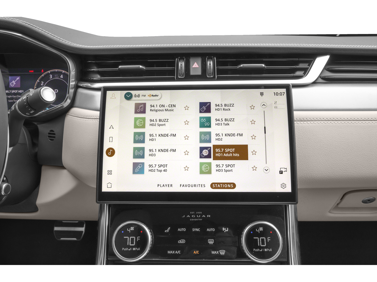 • Radio: Meridian 400W Sound System -inc: Pivi Pro w/11.4" capacitive touchscreen, Amazon Alexa, online pack w/data plan, Apple CarPlay, Android Auto, dynamic volume control, Bluetooth® connectivity, audio streaming, SiriusXM satellite radio, USB, 12V socket in center console, InControl Remote (including remote climate control, lock and unlock, beep and flash, SOS emergency call, Jaguar optimized assistance call and stolen vehicle locator) and wireless device charging