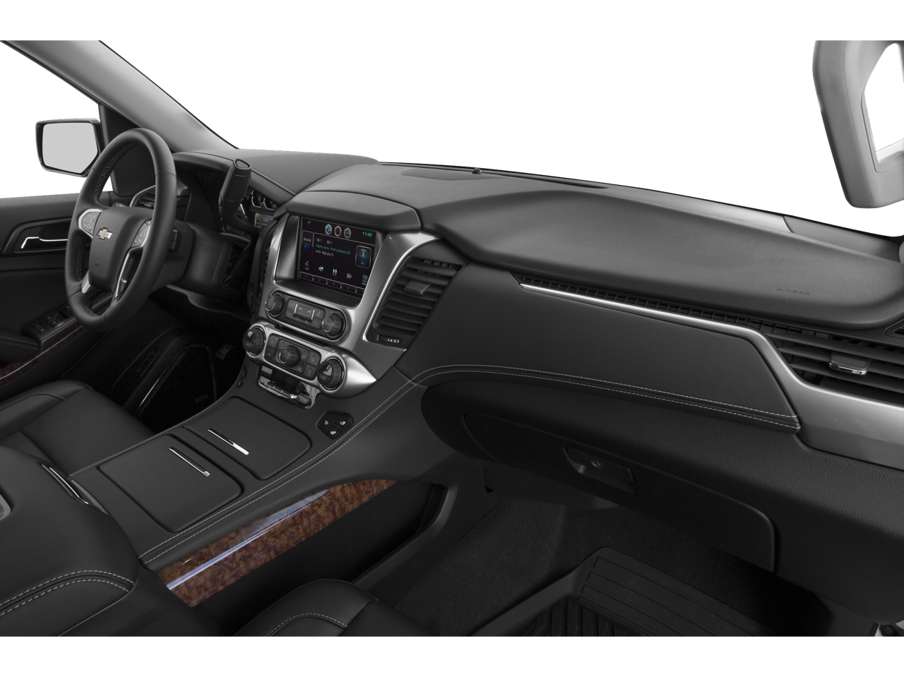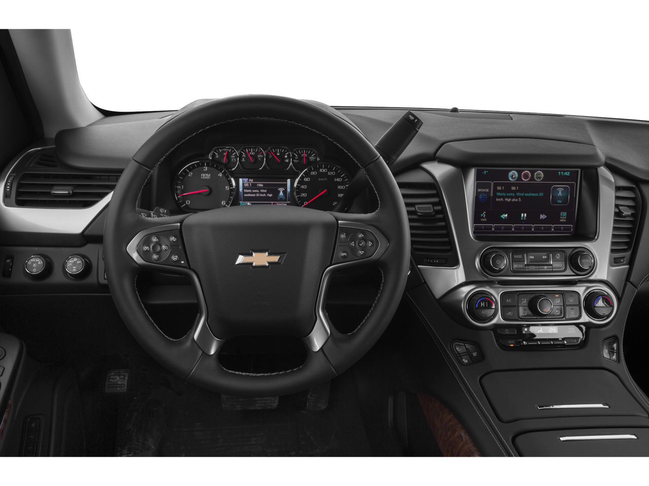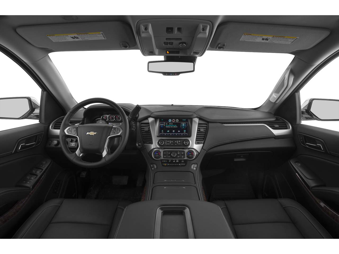 This Tahoe is well equipped with License Plate Front Mounting Package, Magnetic Ride Control Suspension Package, Max Trailering Package (2-Speed Active Electronic AutoTrac Transfer Case and Integrated Trailer Brake Controller), Preferred Equipment Group 1LZ (3rd Row 60/40 Power Fold Split-Bench, 5 12-Volt Auxiliary Power Outlets, Auto-Dimming Inside Rear-View Mirror, Bose Centerpoint Premium 10-Speaker Surround Sound, Driver Inboard & Front Passenger Airbags, Floor Console, Fog Lamps, Forward Collision Alert, Front & Rear Parking Assist, Hands Free Power Liftgate, Heated 2nd Row Seats, Heated Leather Wrapped Steering Wheel, Heavy-Duty Rear Locking Differential, Keyless Start Switch, Lane Departure Warning & Safety Alert Seat, Memory Settings, Passive Entry System, Power Adjustable Pedals, Power Release 2nd Row Bucket Seats, Power Tilt & Telescoping Steering Column, Power-Folding Heated Outside Mirrors, Rear Cross-Traffic Alert, Remote Keyless Entry, Side Blind Zone Alert w/Lane Change Alert, Universal Home Remote, and Wireless Charging), Sun, Entertainment & Destinations Package (Power Sunroof and Rear Seat Blu-Ray/DVD Entertainment System), 4WD, Cocoa/Mahogany Leather, 10 Speakers, 3rd row seats: split-bench, 4-Wheel Disc Brakes, ABS brakes, Adaptive Cruise Control w/Front Automatic Braking, Adaptive suspension, Adjustable pedals, Air Conditioning, Alloy wheels, AM/FM radio: SiriusXM, Auto-dimming door mirrors, Auto-dimming Rear-View mirror, Automatic temperature control, Bluetooth® For Phone, Bodyside moldings, Brake assist, Bumpers: body-color, CD player, Compass, Delay-off headlights, Driver door bin, Driver vanity mirror, Dual front impact airbags, Dual front side impact airbags, Electronic Stability Control, Emergency communication system: OnStar Directions & Connections, Exterior Parking Camera Rear, Front anti-roll bar, Front Bucket Seats, Front Center Armrest, Front dual zone A/C, Front fog lights, Front Heated Reclining Bucket Seats, Front reading lights, Front wheel independent suspension, Fully automatic headlights, Garage door transmitter, Heated & Cooled Driver & Front Passenger Seats, Heated door mirrors, Heated front seats, Heated rear seats, Heated steering wheel, High-Intensity Discharge Headlights, Illuminated entry, Low tire pressure warning, Memory seat, Navigation System, Occupant sensing airbag, Outside temperature display, Overhead airbag, Overhead console, Panic alarm, Passenger door bin, Passenger vanity mirror, Pedal memory, Perforated Leather-Appointed Seat Trim, Polished Exhaust Tips, Power door mirrors, Power driver seat, Power Liftgate, Power passenger seat, Power steering, Power windows, Power-Retractable Assist Steps, Premium audio system: Chevrolet MyLink, Radio: Chevrolet MyLink w/Navigation/AM/FM Stereo, Rain sensing wipers, Rear air conditioning, Rear anti-roll bar, Rear reading lights, Rear window defroster, Rear window wiper, Remote keyless entry, Roof rack: rails only, Security system, Set of 4 Wheel Locks (LPO), Single-Slot CD/MP3 Player, SiriusXM Satellite Radio, Speed control, Speed-sensing steering, Split folding rear seat, Spoiler, Steering wheel memory, Steering wheel mounted audio controls, Tachometer, Telescoping steering wheel, Tilt steering wheel, Traction control, Trip computer, Turn signal indicator mirrors, VAC Power 4-Wheel Disc & 4-Wheel Antilock Brakes, Variably intermittent wipers, Ventilated front seats, Voltmeter, Wheels: 20" x 9" Polished-Aluminum, and Wheels: 22" Premium Painted w/Chrome Inserts.